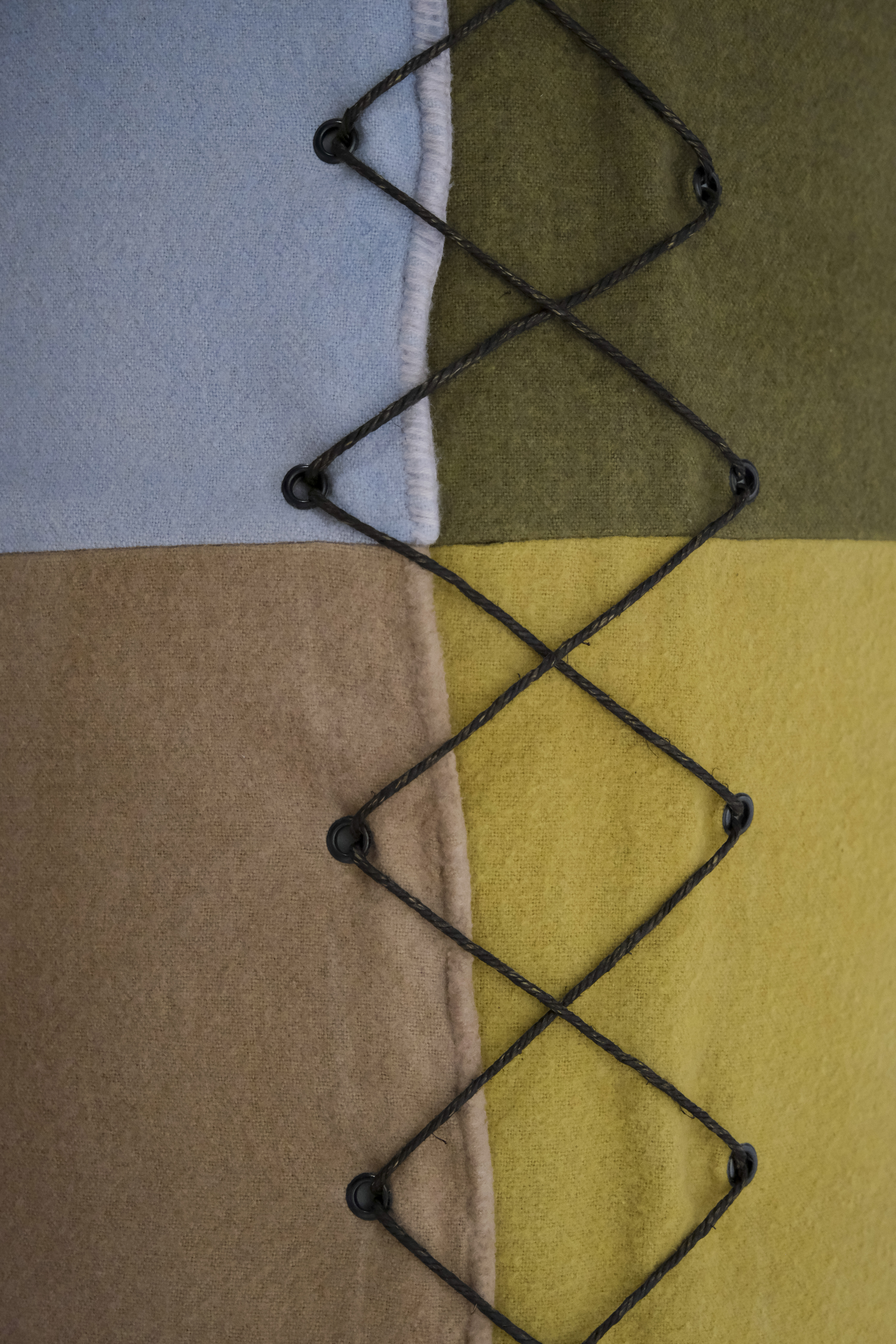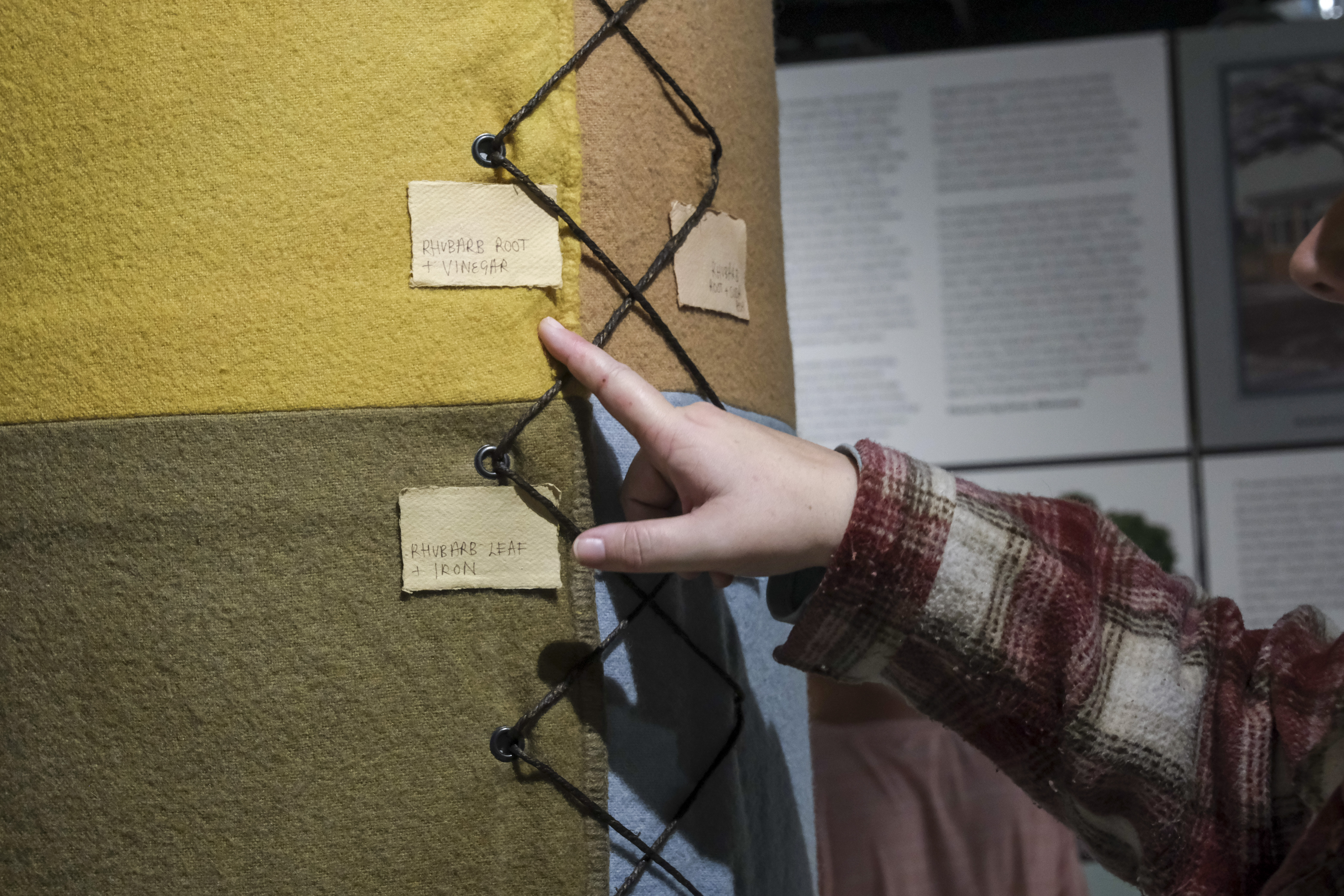Upcycling woolen blankets dyed with rhubarb root, rhubarb leaf and celtic woad in response to the project’s colours designed by Keith Dodds.